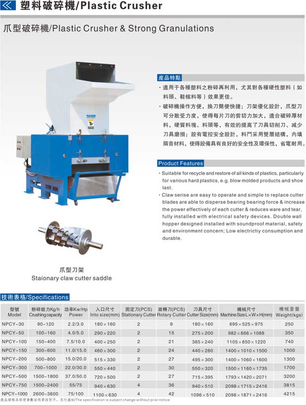 適用于各種逆料之粉碎再利用,尤其對各類硬性塑料(如料頭,鞋楦料等)效果更佳。NPCY系列破碎機操作方便,換刀簡便快捷;刀架優(yōu)化設計,爪型刀可分散受力度,便得每片刀和剪切力加大,適合破碎厚材料,硬質(zhì)料塊,料頭等,有效的提高了刀具切削力,減少刀具磨損;設有電控按全設計,料頭采用雙層結構,內(nèi)填隔音材料,使得設備具有良好的安全性及環(huán)保性,省電耐用。